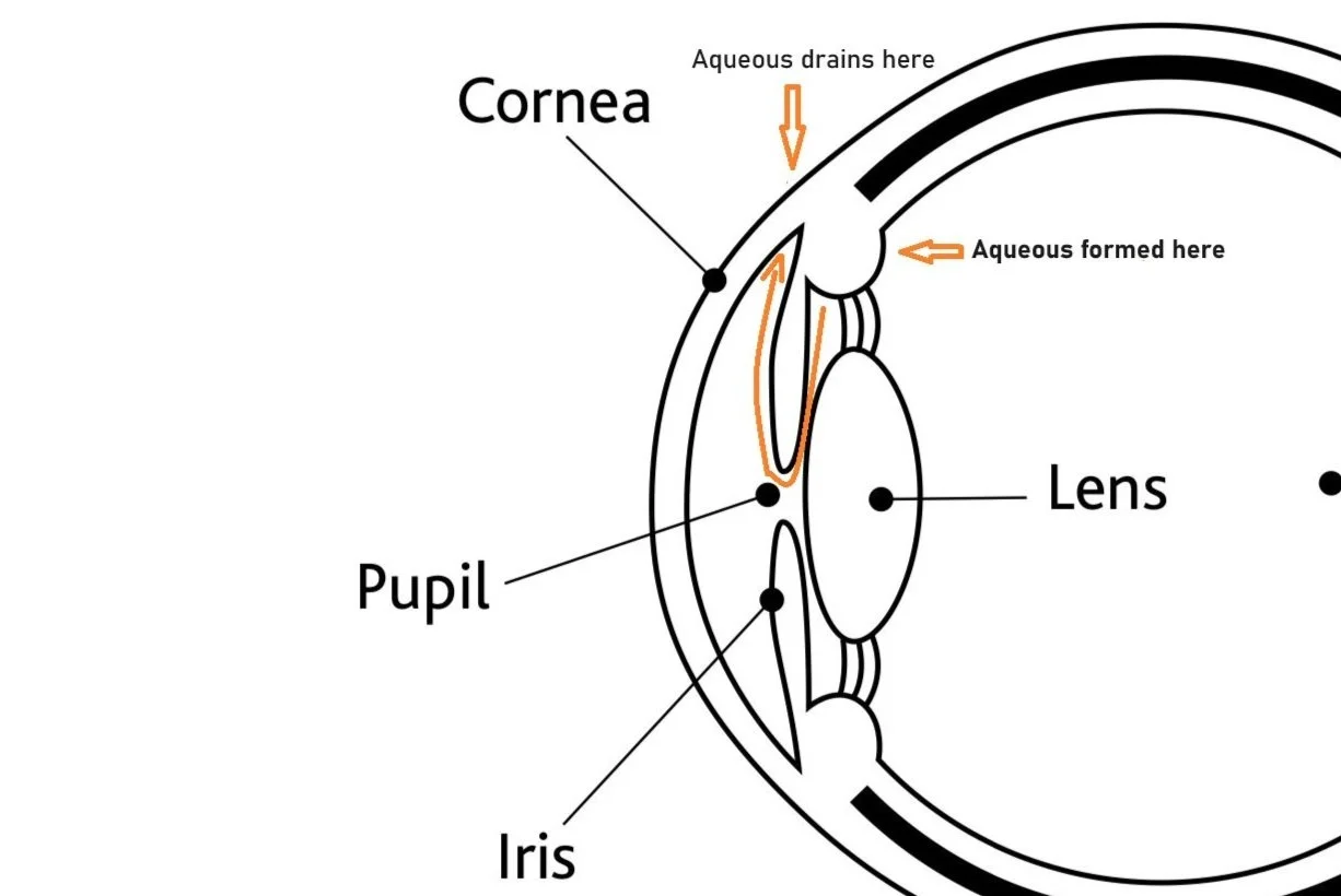 Imagine your eye as a sink, in which the tap is always running and the drain is always open. The aqueous humor is constantly circulating fluid through the front of the eye. It is produced by a tiny gland, called the ciliary body, situated behind the iris (coloured part). It flows between the iris and the lens and, after nourishing the cornea and lens, flows out through a very tiny spongy tissue (0.5mm in size), called the trabecular meshwork, which serves as the drain of the eye. The trabecular meshwork is situated in the angle where the iris and cornea meet. When this drain becomes clogged, aqueous can not leave the eye as fast as it is produced, causing the fluid to back up. But since the eye is a closed compartment, your `sink´ doesn´t overflow; instead the backed up fluid causes increased pressure to build up within the eye. We call this open (wide) angle glaucoma.